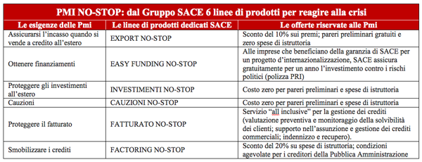 Obiettivo dell’iniziativa è offrire alle Pmi un one stop shop per rispondere alle sfide poste dall’attuale congiuntura. In particolare, lo schema messo a punto da SACE consente alle imprese di ottenere più facilmente finanziamenti, gestire al meglio i propri crediti, ridurre i rischi di mancato pagamento e muoversi in sicurezza verso nuovi mercati – oggi scelta obbligata per controbilanciare la debolezza della domanda dei mercati avanzati.