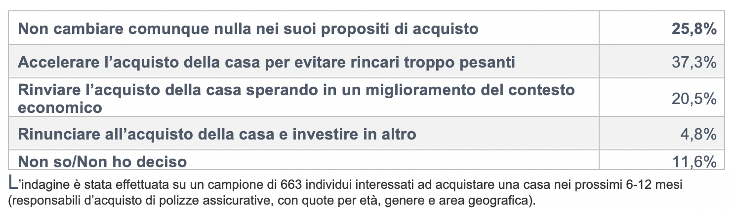 L’aumento del costo del mutuo spaventa gli italiani ma non li scoraggia ad acquistare casa. Poco meno di quattro cittadini su dieci che avevano programmato di acquistare casa, stanno cercando di accelerare i tempi in modo da contenere l’effetto del previsto rialzo dei tassi di interesse, ma molti sono anche coloro i quali hanno deciso di rinviare l’investimento.
