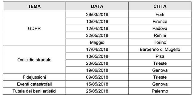 Il primo incontro formativo in calendario, il 29 marzo a Forlì presso la Sala del Consiglio Provinciale, sarà dedicato al GDPR e alle sue implicazioni in ambito PA. Oltre agli interventi dei professionisti di Aon Hewitt si susseguiranno quelli di diversi studi legali: Studio Legale CNTTV, Studio Legale Batini Traverso & Associati, Studio Legale Cresci, Studio Legale Usai. Tali studi, insieme ad altri importanti, come PwC Tls Avvocati e Commercialisti, Studio Legale Avvocato Gian Carlo Soave, Studio IIA, si alterneranno nelle platee delle diverse città che saranno toccate dal ciclo di incontri nel corso dell’anno.