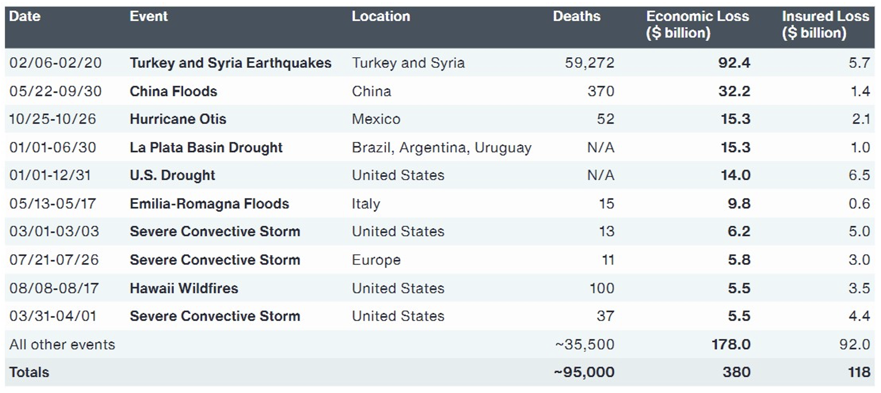 Nel 2023 sono stati registrati 66 eventi da un miliardo di dollari ciascuno di perdite economiche e 37 eventi da un miliardo di dollari ciascuno di perdite assicurate. I terremoti sono sempre la causa delle maggiori perdite economiche, mentre le tempeste convettive si sono rivelate le più costose per gli assicuratori. La Nuova Zelanda, l'Italia, la Grecia, la Slovenia e la Croazia hanno registrato gli eventi più costosi in assoluto legati al maltempo.