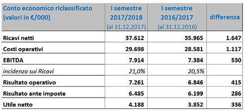 L’EBITDA, pari a euro 7,9 milioni, registra una crescita sia in termini assoluti (+7% rispetto al semestre 2016/2017) sia in termini di marginalità (+21% rispetto al 20,5% dello stesso precedente periodo).