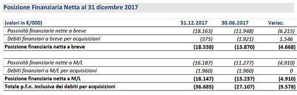 La posizione finanziaria netta, inclusiva dei debiti per acquisizioni, segna un incremento rispetto al 30 giugno 2017 di 9,5 mln come si può rilevare del prospetto di dettaglio sotto riportato.