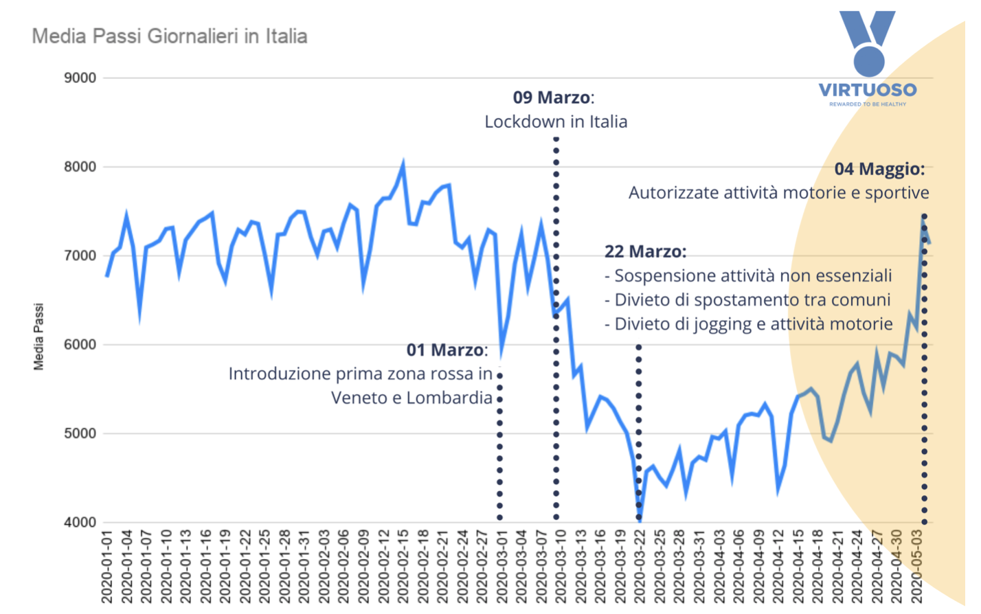 Dal 1° Gennaio, periodo in cui già in Cina si parlava della diffusione del virus, al 31 Gennaio, giorno in cui i primi due casi sono stati confermati in Italia, la media era di circa 7400 passi giornalieri.
