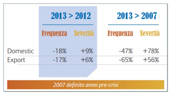 I mancati pagamenti delle imprese italiane nel 2013 segnano, rispetto all’anno 2012, un calo sul fronte della frequenza sia sul mercato nazionale (-18%) sia nell’export (-17%). L’indicatore della severità, invece, registra sia un incremento in Italia (+9%) sia nei confronti dei mercati esteri (+ 6%). A destare maggiore preoccupazione è il livello degli importi medi, in Italia, rispetto al 2007 (pre-crisi), che a dicembre 2013 era superiore del 78%.