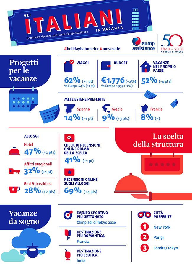 Se il budget che gli europei affermano in media di voler destinare alle vacanze si abbassa di 2 punti percentuali rispetto al 2017 (€ 1.957), dato che comprende anche Paesi fuori dalla zona Euro, l’Italia è tra le nazioni virtuose. Un rinnovato ottimismo economico porta a dichiarazioni di spesa pro capite per l’estate 2018 in crescita del 2% rispetto allo scorso anno: 1.776 euro da destinare alle vacanze estive per i nostri connazionali.