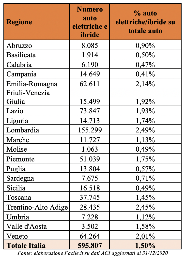 In valori assoluti, la graduatoria nazionale vedeva al primo posto sempre la Lombardia (155.299 auto elettriche e ibride) seguita questa volta dal Lazio (73.847) e dal Veneto (64.264).