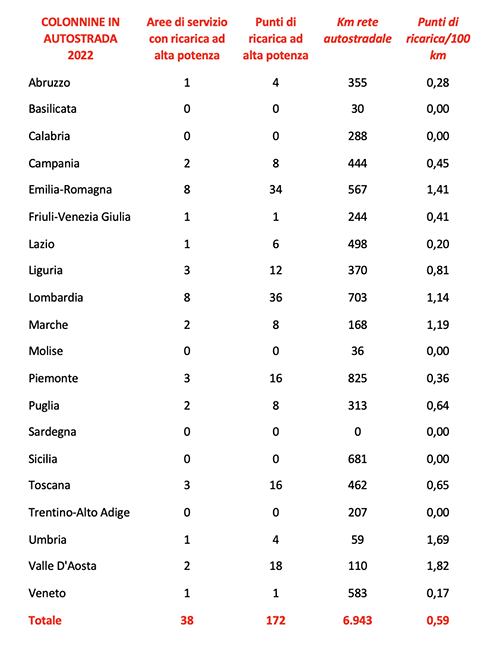 Il report aggiornato al mese di luglio evidenzia che su 506 stazioni di servizio operative in autostrada, 59 dispongono di colonnine per un totale 254 punti di ricarica, ma i numeri si riducono a 38 stazioni di servizio e 172 punti di ricarica se si considerano solo le colonnine cosiddette ad “alta potenza” (da 150 a 350 kW), che sono quelle necessarie all’atto pratico per ricaricare in tempi ragionevoli (15-30 minuti a seconda del modello) durante un viaggio, magari per raggiungere una località di vacanza insieme alla famiglia.