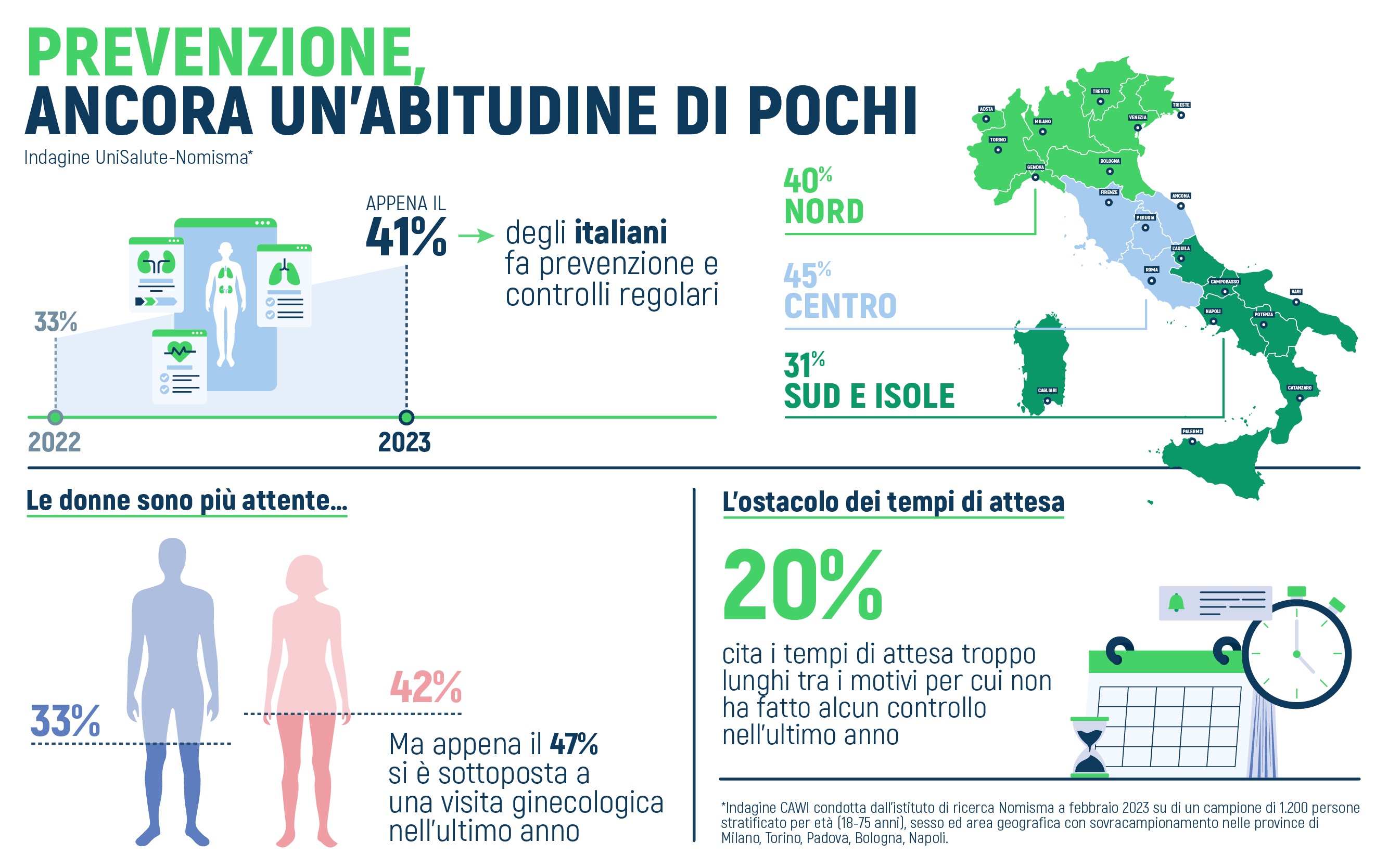Cresce – seppur di poco - l’attenzione degli italiani per la propria salute: a dirlo è l’ultima rilevazionedell’Osservatorio Sanità di UniSalute, svolto in collaborazione con l’istituto di ricerca Nomisma. L’indagine, che periodicamente sonda l’attitudine alla prevenzione degli abitanti del Bel Paese, ha riscontrato un aumento del numero di persone che fanno controlli regolari, sintomo forse di una maggior serenità nel frequentare le strutture sanitarie dopo gli anni di pandemia. Restano però ancora una minoranza gli italiani che svolgono visite ed esami di prevenzione.