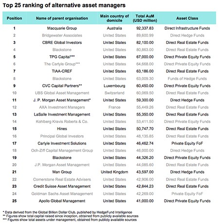 Dal punto di vista dei singoli gestori, Macquarie domina il settore gestito della infrastrutture con $ 92 miliardi, mentre Bridgewater Associates, con quasi $ 90 miliardi, è il maggiore gestore di hedge fund. Nella classifica, CBRE Global Investors ($ 82 miliardi) è il più grande gestore immobiliare e TPG Capital è il maggiore in private equity con $ 67 miliardi. Blackstone è il più grande gestore di FoHF con oltre $ 63 miliardi e Carlyle Investment Solutions è il più grande gestore PEFoF con oltre $ 46bn. M&G Investments è il maggiore gestore di credito illiquido con oltre $ 33 miliardi, mentre PIMCO domina nelle materie prime con quasi $ 19 miliardi. Infine, TIAA-CREF è il più grande gestore real asset con oltre 7 miliardi di dollari.