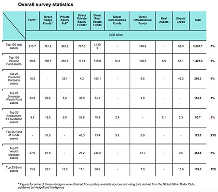 Nel 2014, il patrimonio gestito dai primi 100 fondi di investimento alternativi ha raggiunto un valore complessivo di 3.500 miliardi di dollari (3.300 miliardi nel 2013). Questo è quanto emerso dal Global Alternatives Survey realizzato da Towers Watson in collaborazione con il Financial Times.