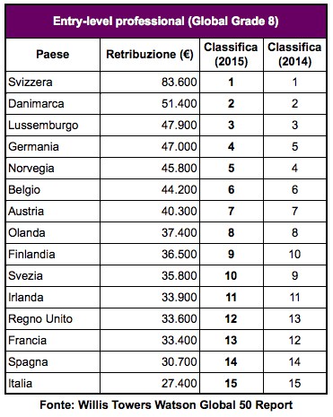 L’indagine, che confronta 15 economie del vecchio continente, vede il nostro paese rimanere, come lo scorso anno, all’ultima posizione per quanto riguarda i salari d’ingresso con una media di circa 27.000 Euro. Guadagna, invece, una posizione per quanto riguarda le retribuzioni dei middle manager, posizionandosi all’11 posto con una media che sfiora i 71.000 Euro, seguita solo da Francia, Svezia, Finlandia e Spagna.
