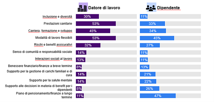 Per quasi la metà dei dipendenti italiani la priorità è il benessere finanziario di lungo termine. Poter contare su un dignitoso futuro pensionistico occupa la prima posizione tra i benefit desiderati dai dipendenti, seguito da lavoro flessibile (45%), percorsi di carriera e sviluppo (34%), prestazioni sanitarie (33%) e benefit assicurativi (27%).