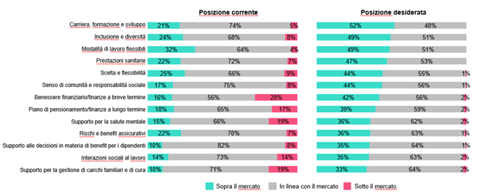 Lo scenario cambia se guardiamo all’orientamento futuro delle aziende: circa il 40% mostra il desiderio di migliorare la propria offerta di benefit in questi due ambiti nei prossimi due anni, rispetto ai principali concorrenti.